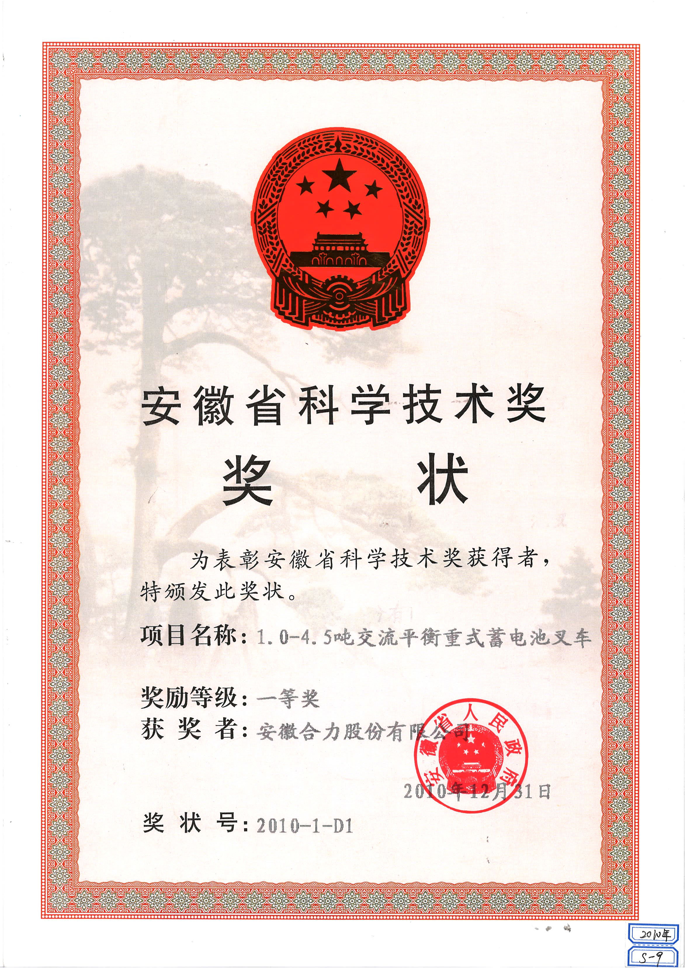 2010 安徽省科学技术奖奖状:1.0-4.5����� �������Ƴ������������ �������Ƴ������������ �������Ƴ�������吨交流平衡重式蓄电池叉车一等奖