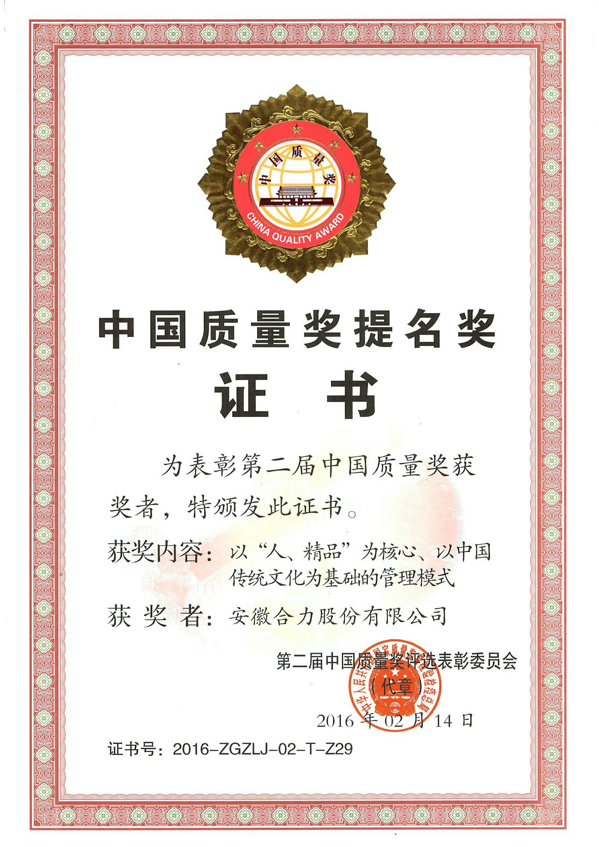 2016 第二届中国质量奖提名奖