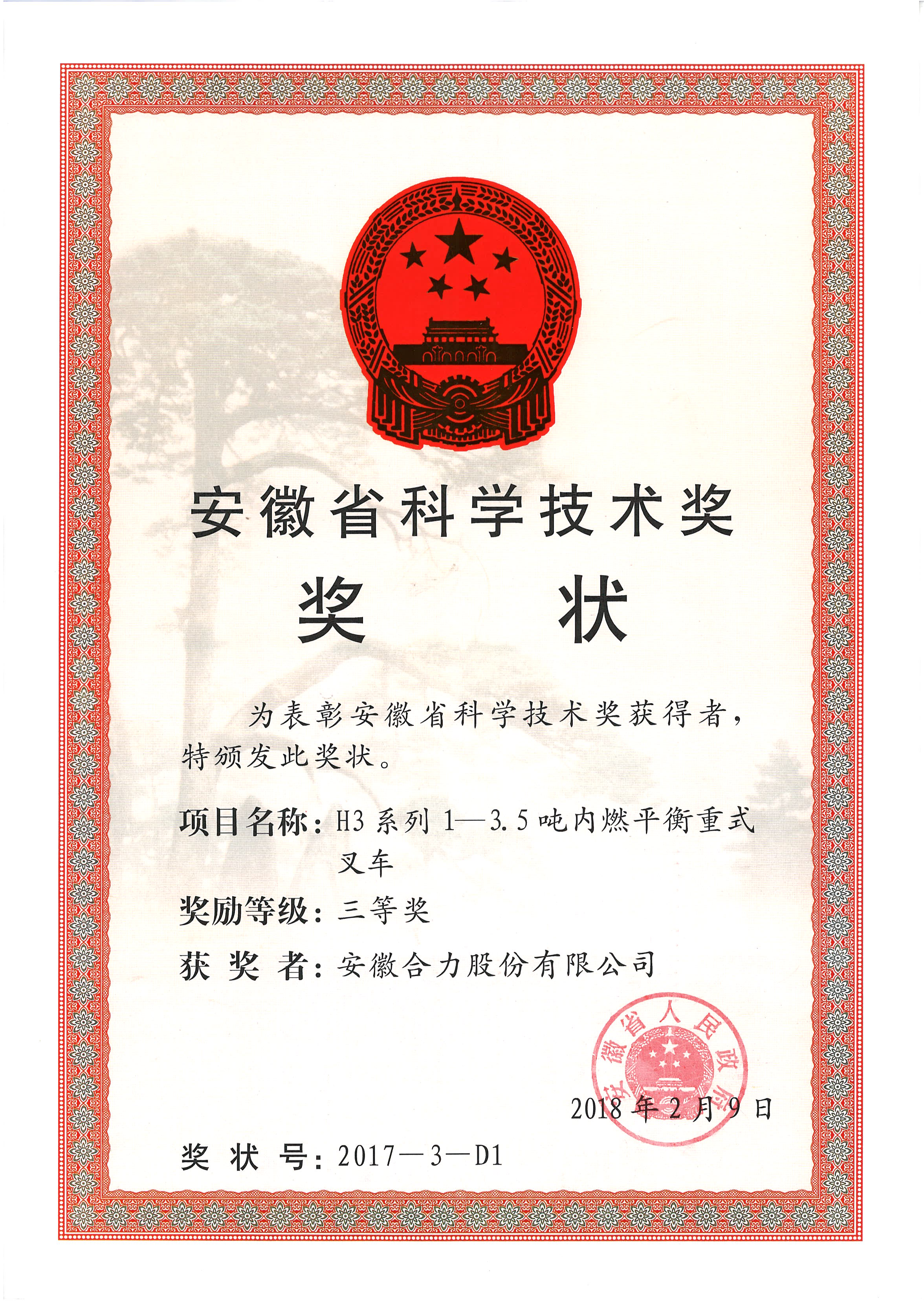 2018 安徽省科学技术奖����� �������Ƴ������������ �������Ƴ�������三等奖 H3系列1-3.5吨内燃平衡重式叉车